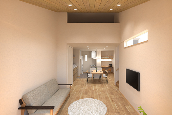 勾配天井のリビングで、家族みんながゆったりと過ごしやすいすまい。